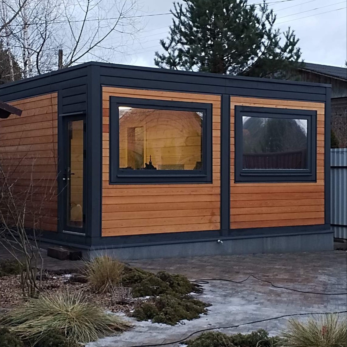 Отделка модуля снаружи – планкен из дерева хвойных пород с добавлением доборных элементов, экобрус (изготовлен из оцинкованного металла, покрытого полимерным покрытием, в виде деревянного полубруса с различными колеровками), профлист, вагонка, фальцевая кровля, ЦСП, ОСП, мембрана или панели сэндвич. Кровля – профлист.