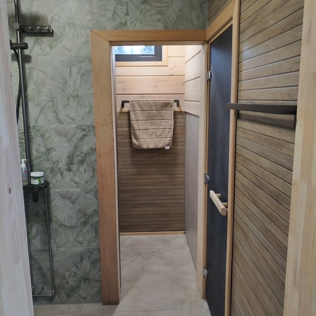 Окна и двери - ПВХ, с одно- или двухсторонней ламинацией профиля, или алюминий, можно установить металлическую дверь. В парной окна в деревянных рамах. В санузле и парной двери стеклянные, можно сдвижные.