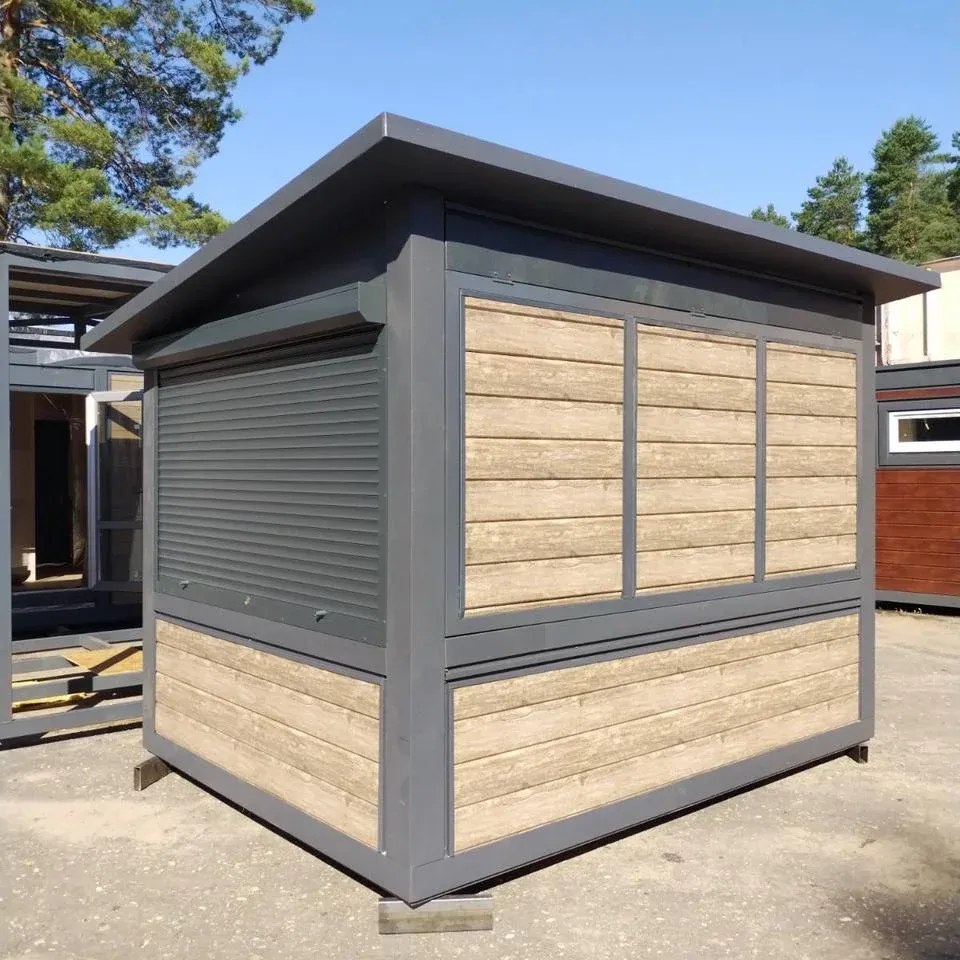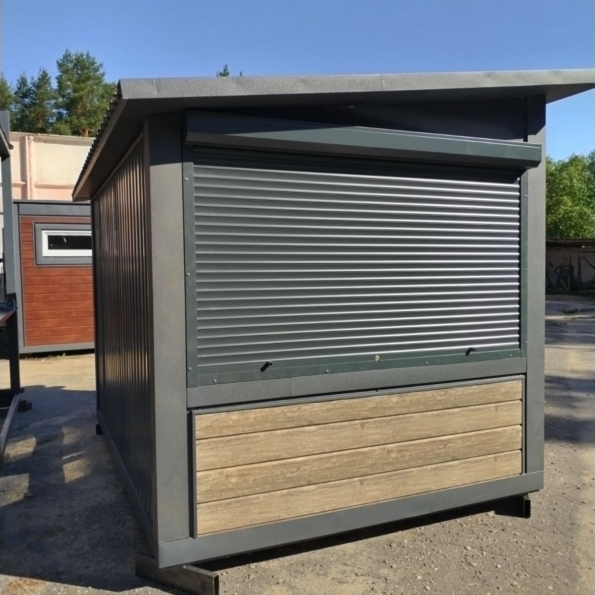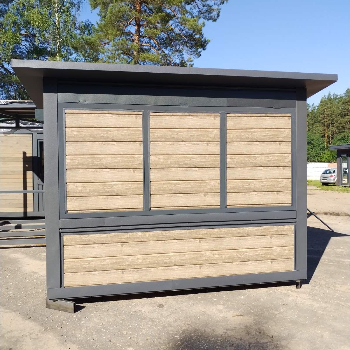 Окна и двери - ПВХ ,с одно- или двухсторонней ламинацией профиля ,или алюминий, можно установить металлическую дверь. Снизу модуль подшит оцинкованным профлистом.