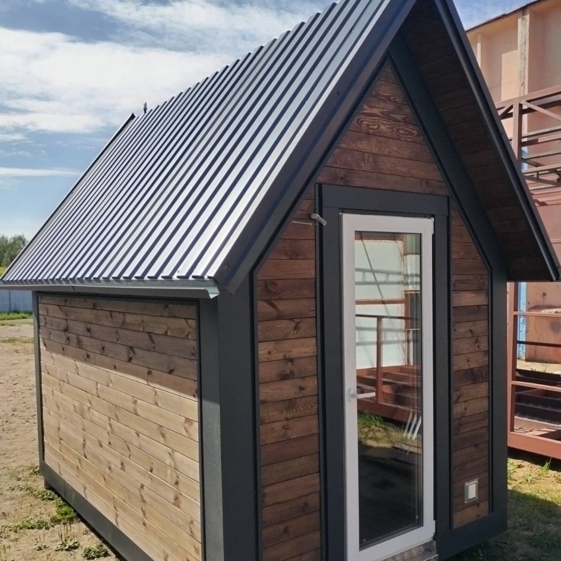 Кровля – профлист. Строение может набираться из нескольких модулей, которые легко и герметично стыкуются между собой.