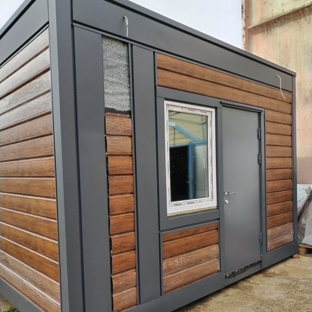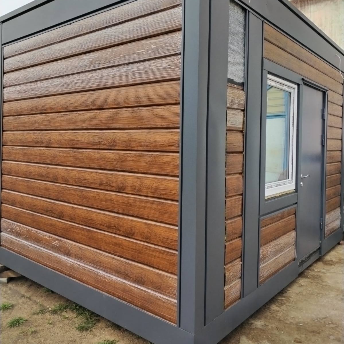 Окна и двери - ПВХ ,с одно- или двухсторонней ламинацией профиля ,или алюминий, можно установить металлическую дверь. Снизу модуль подшит оцинкованным профлистом.