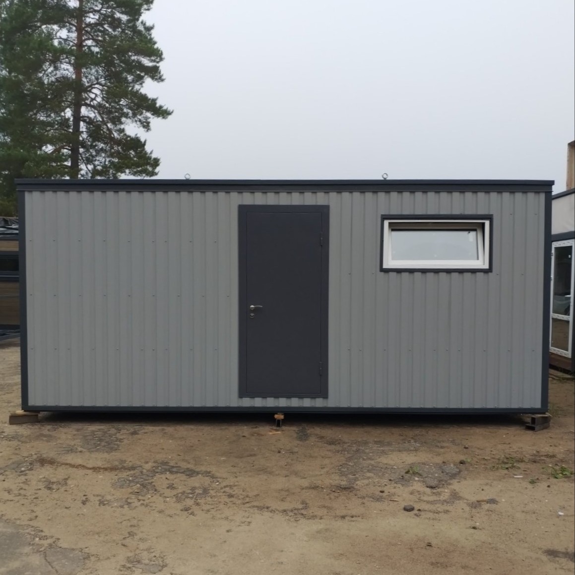 Окна и двери - ПВХ ,с одно- или двухсторонней ламинацией профиля ,или алюминий, можно установить металлическую дверь. Снизу модуль подшит оцинкованным профлистом.