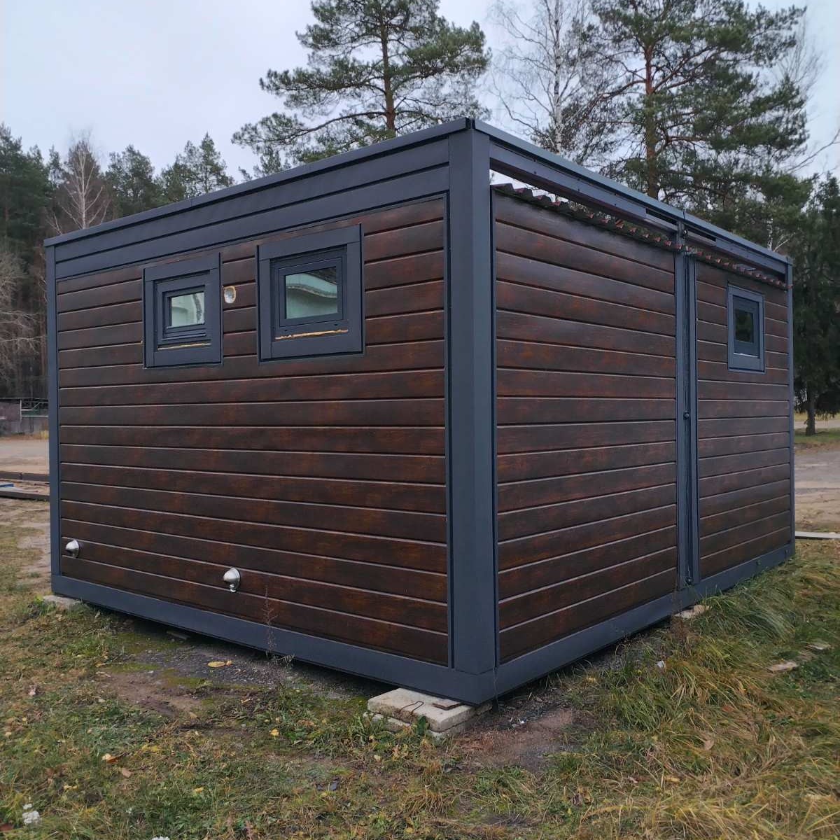 Отделка модуля снаружи – планкен из дерева хвойных пород с добавлением доборных элементов, экобрус (изготовлен из оцинкованного металла, покрытого полимерным покрытием, в виде деревянного полубруса с различными колеровками), профлист, вагонка, фальцевая кровля, ЦСП, ОСП, мембрана или панели сэндвич. Кровля – профлист.