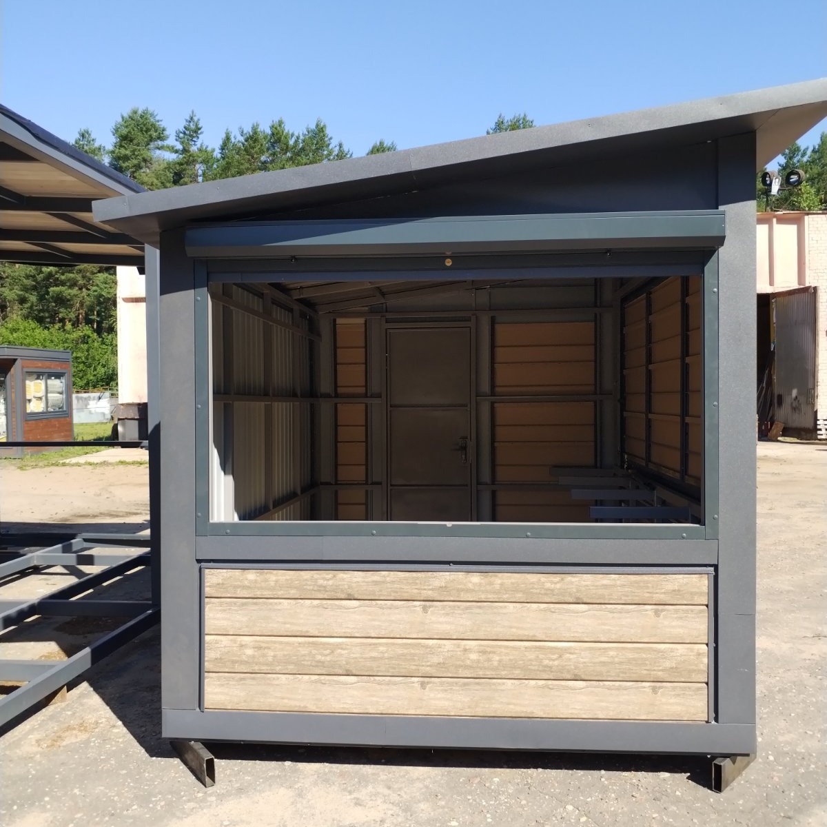 Окна и двери - ПВХ ,с одно- или двухсторонней ламинацией профиля ,или алюминий, можно установить металлическую дверь. Снизу модуль подшит оцинкованным профлистом.