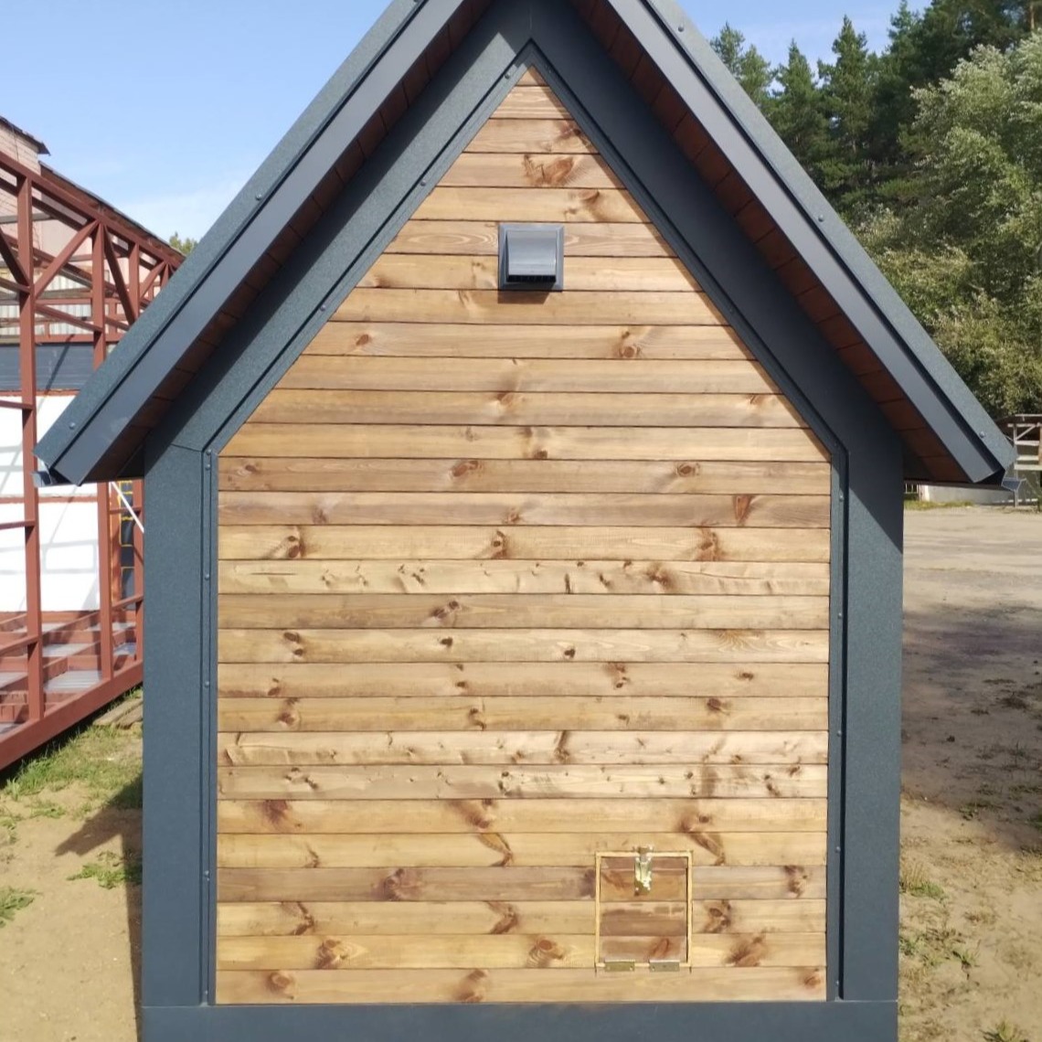 Кровля – профлист. Строение может набираться из нескольких модулей, которые легко и герметично стыкуются между собой.