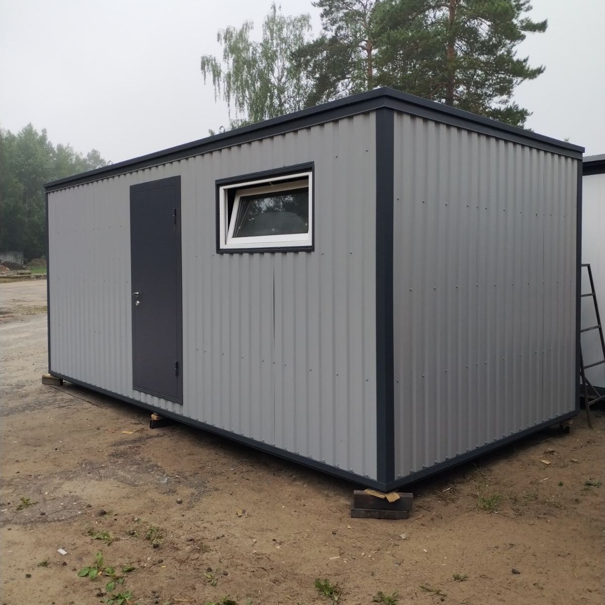 Окна и двери - ПВХ ,с одно- или двухсторонней ламинацией профиля ,или алюминий, можно установить металлическую дверь. Снизу модуль подшит оцинкованным профлистом.